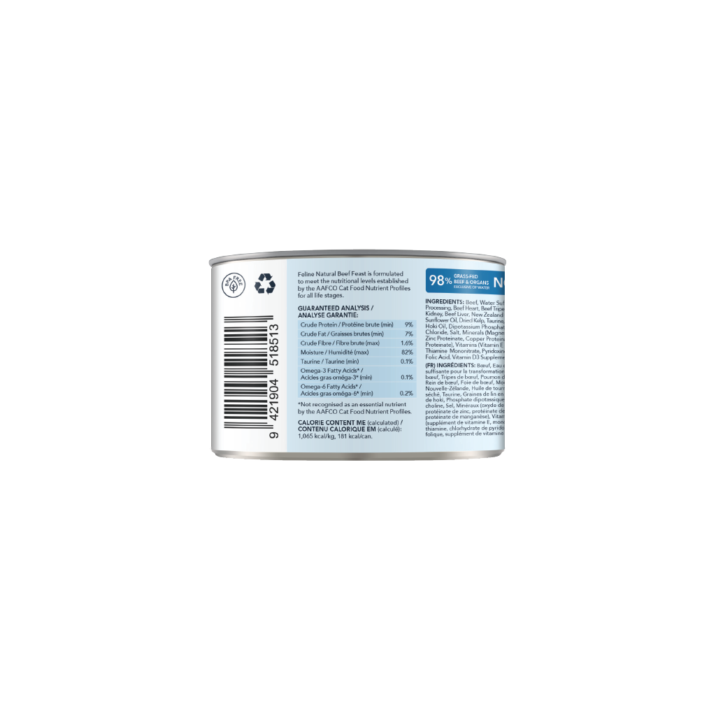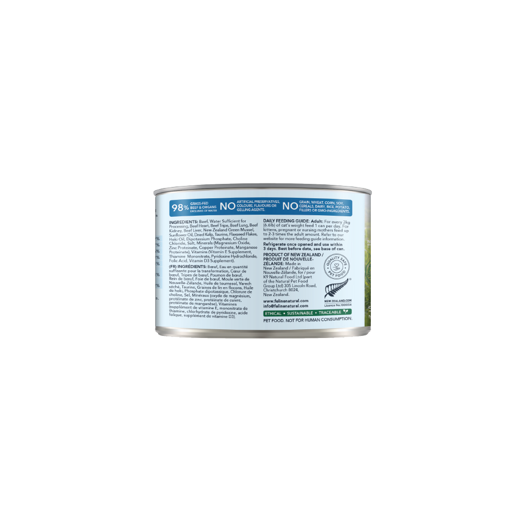 Beef, Water Sufficient for Processing, Beef Tripe, Beef Heart, Beef Kidney, Beef Liver, Beef Spleen, Beef Blood, New Zealand Green Mussel, Fish Oil, Flaxseed Flakes, Sunflower Oil, Dipotassium Phosphate, Dried Kelp, Salt, Taurine, Vitamin E Supplement, Magnesium Oxide, Zinc Proteinate, Copper Proteinate, Manganese Proteinate, Thiamine Mononitrate, Folic Acid, Vitamin D3 Supplement.