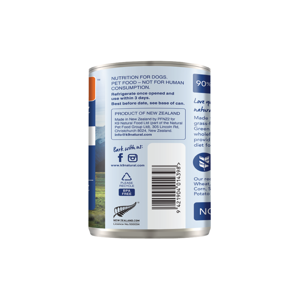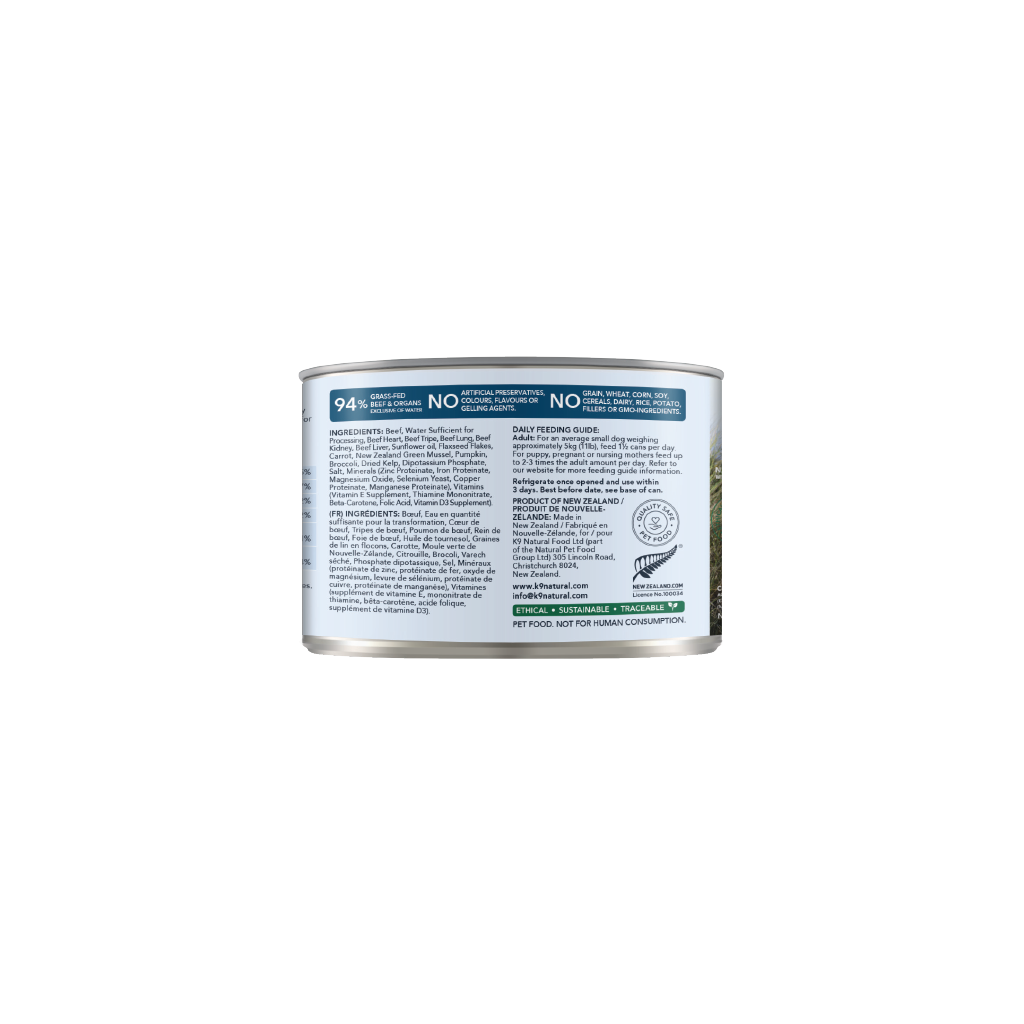 Beef, Water Sufficient for Processing, Beef Heart, Beef Tripe, Beef Lung, Beef Kidney, Beef Liver, Sunflower oil, Flaxseed Flakes, Carrot, New Zealand Green Mussel, Pumpkin, Broccoli, Dried Kelp, Dipotassium Phosphate, Salt, Minerals (Zinc Proteinate, Iron Proteinate, Magnesium Oxide, Selenium Yeast, Copper Proteinate, Manganese Proteinate), Vitamins (Vitamin E Supplement, Thiamine Mononitrate, Beta-Carotene, Folic Acid, Vitamin D3 Supplement).