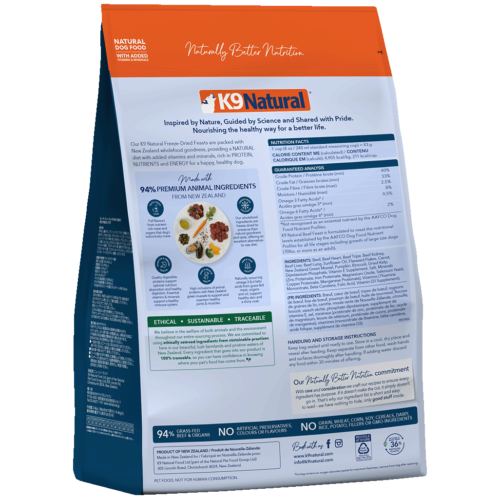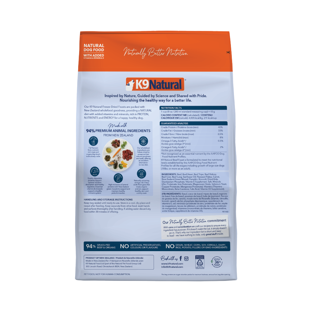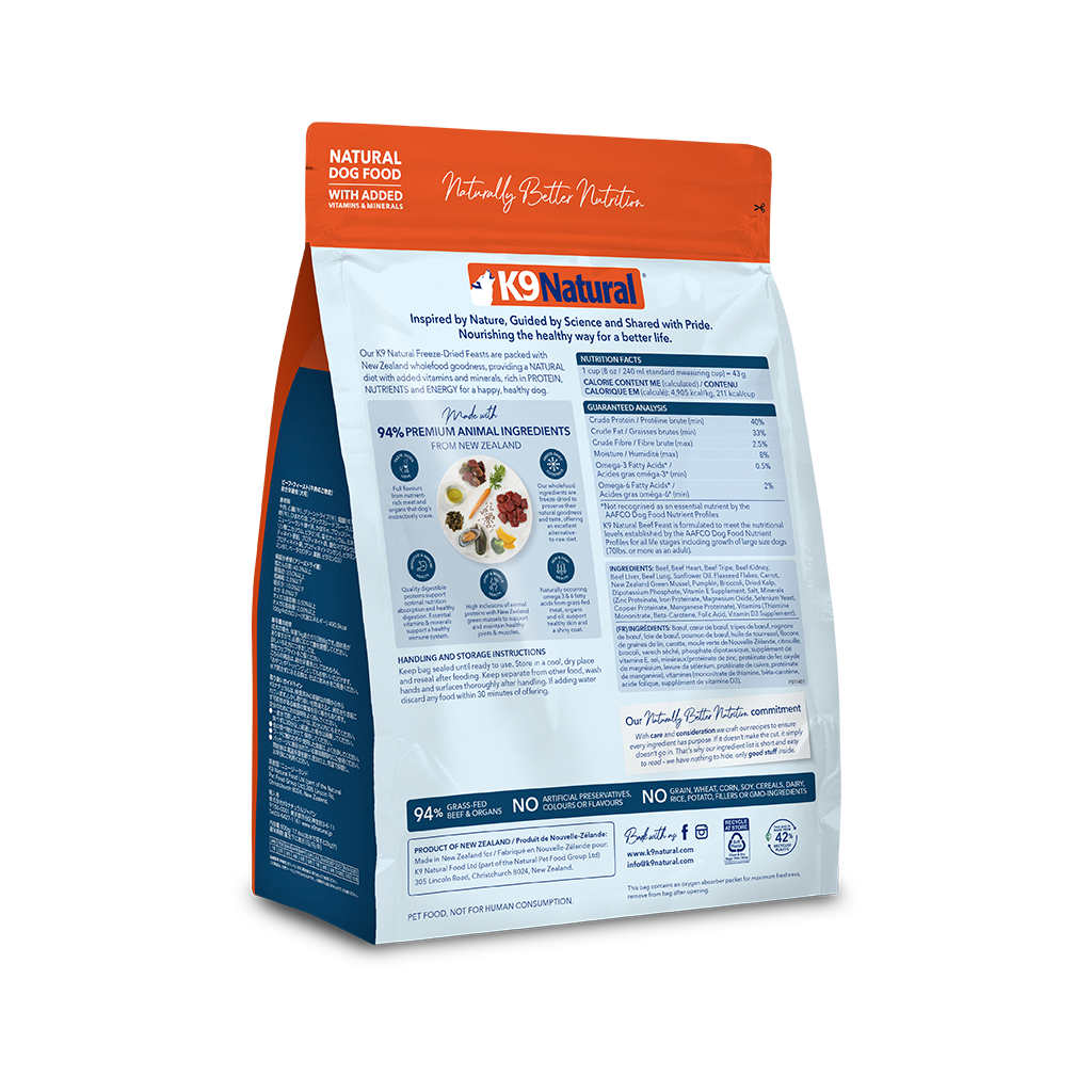 Beef, Beef Heart, Beef Tripe, Beef Kidney, Beef Liver, Beef Lung, Sunflower Oil, Flaxseed Flakes, Carrot, New Zealand Green Mussel, Pumpkin, Broccoli, Dried Kelp, Dipotassium Phosphate, Vitamin E Supplement, Salt, Minerals (Zinc Proteinate, Iron Proteinate, Magnesium Oxide, Selenium Yeast, Copper Proteinate, Manganese Proteinate), Vitamins (Thiamine Mononitrate, Beta-Carotene, Folic Acid, Vitamin D3 Supplement).