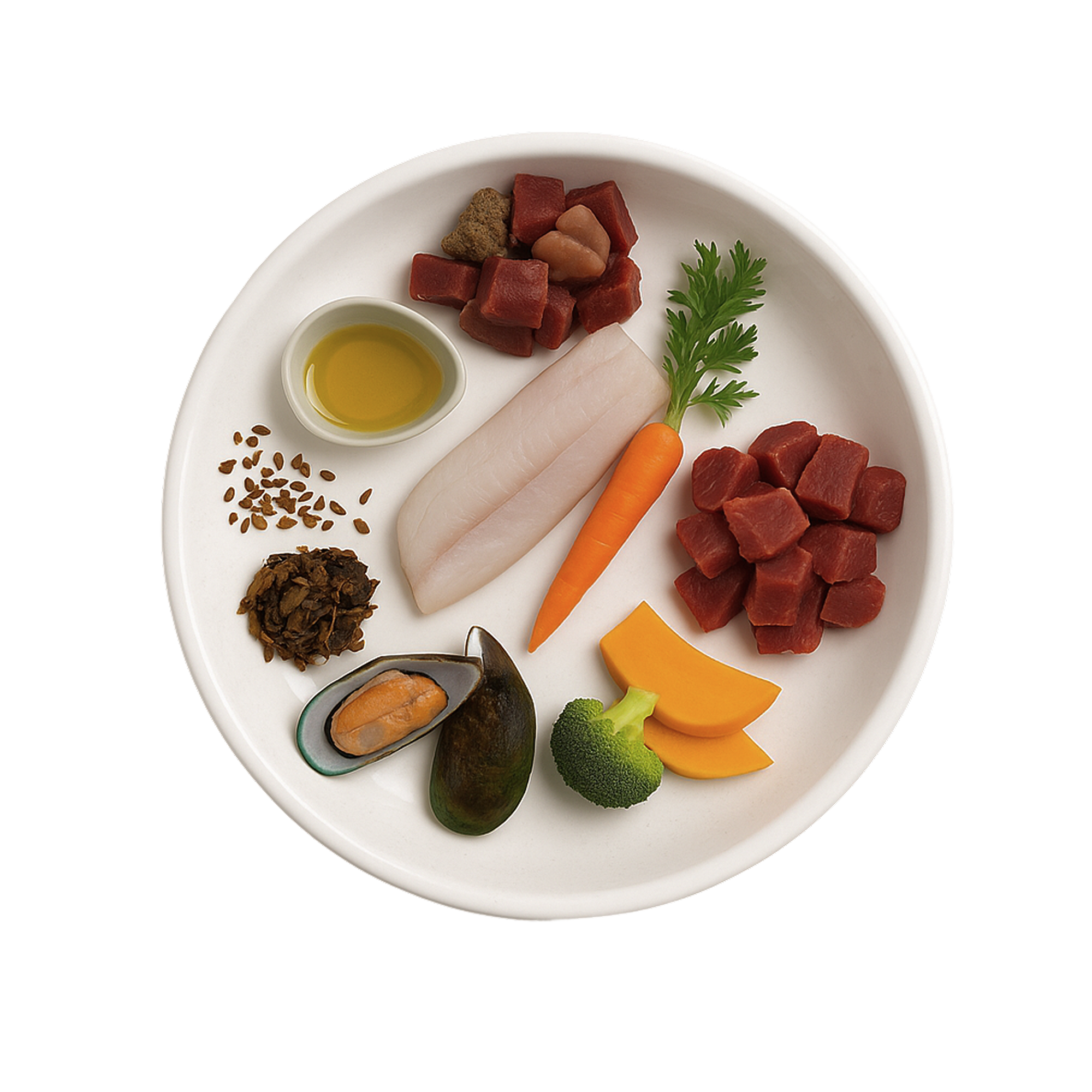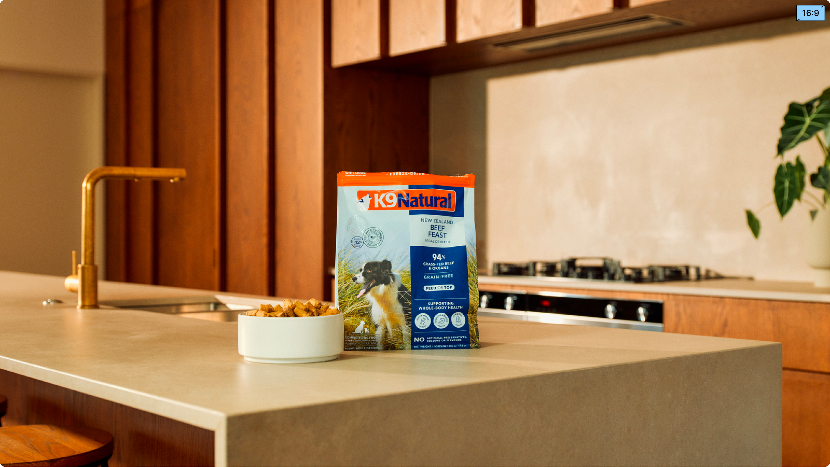 Our complete and balanced Freeze-Dried New Zealand Beef & Hoki Feast contains 94% Grass-fed & Grass-finished Beef & Organs, and Wild-caught Hoki Fish, with New Zealand Green Mussels, Flaxseed Flakes, Vegetables, Oils, Kelp, Vitamins, and Minerals in support of your dog's whole-body health.