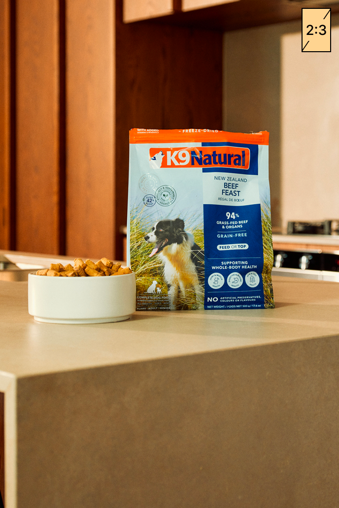 Our complete and balanced Freeze-Dried New Zealand Beef Feast contains 94% Grass-fed & Grass-finished Beef & Organs, with New Zealand Green Mussels, Flaxseed Flakes, Vegetables, Oils, Kelp, Vitamins, and Minerals in support of your dog's whole-body health.