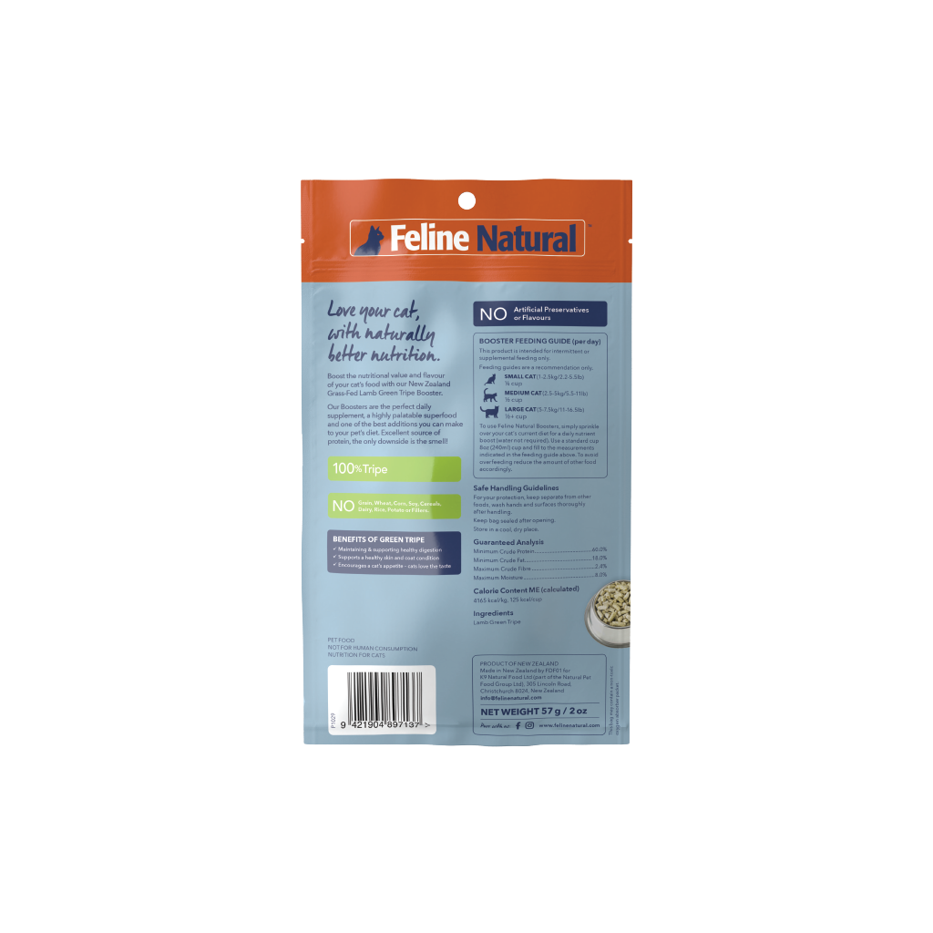 Feline Natural Tripe Boosters are a highly palatable, natural superfood designed to support your cat’s overall health and wellbeing. Made from premium New Zealand grass-fed, free-range green tripe, they provide a rich source of naturally occurring nutrients cats instinctively enjoy.