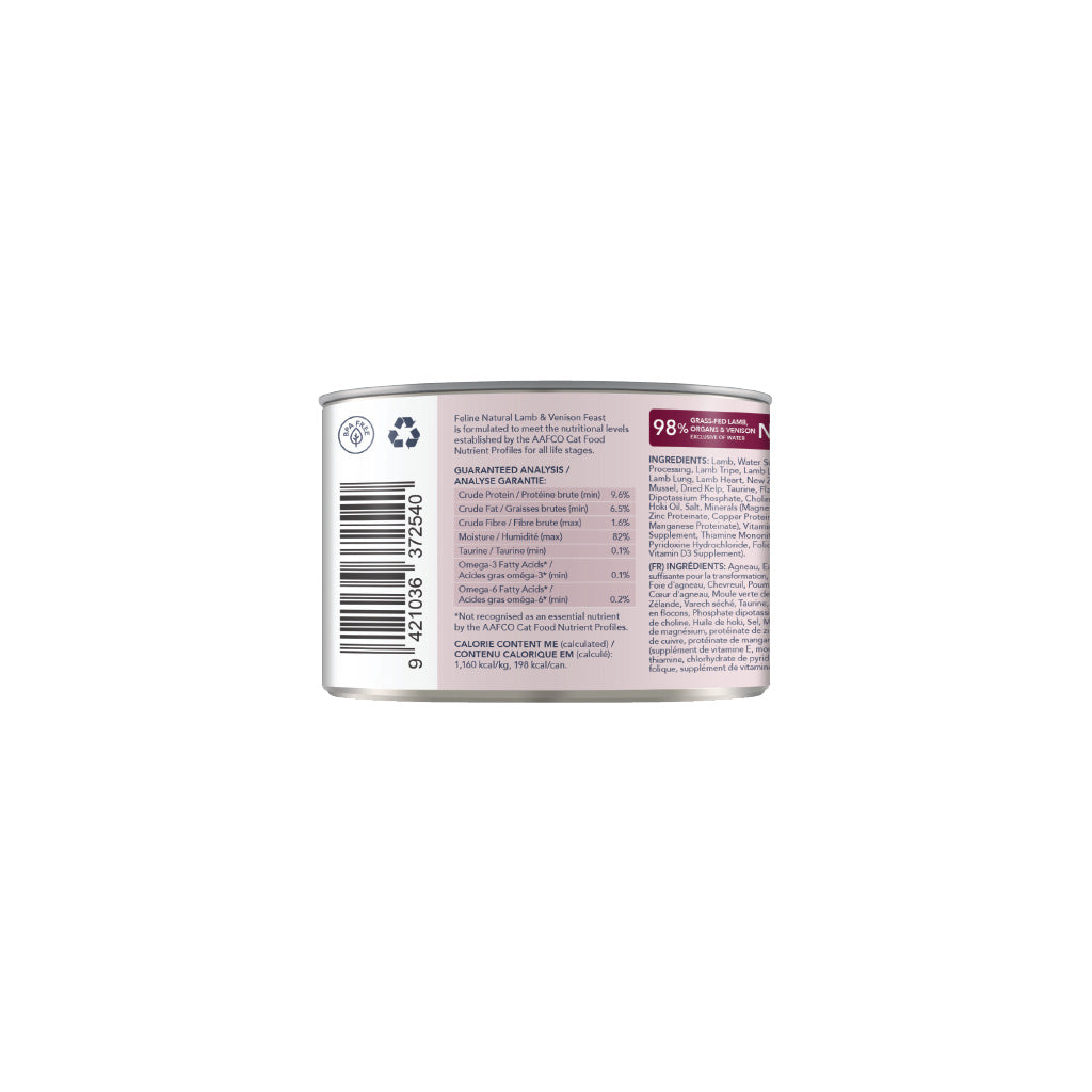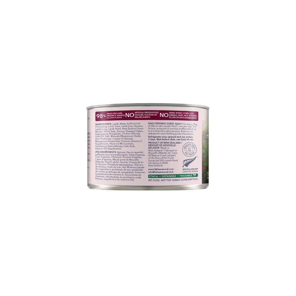 Lamb, Water Sufficient for Processing, Lamb Tripe, Lamb Liver, Venison, Lamb Lung, Lamb Heart, New Zealand Green Mussel, Dried Kelp, Taurine, Flaxseed Flakes, Dipotassium Phosphate, Choline Chloride, Hoki Oil, Salt, Minerals (Magnesium Oxide, Zinc Proteinate, Copper Proteinate, Manganese Proteinate), Vitamins (Vitamin E Supplement, Thiamine Mononitrate, Pyridoxine Hydrochloride, Folic Acid, Vitamin D3 Supplement).