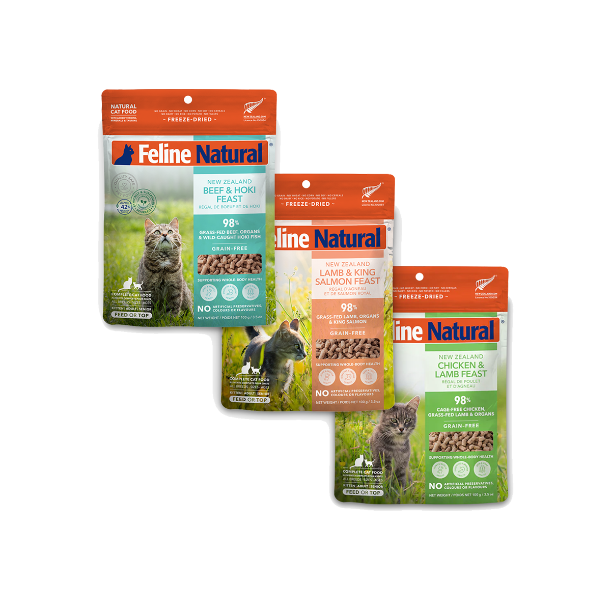 Our complete and balanced Freeze-Dried New Zealand Beef & Hoki Feast contains 98% Grass-fed & Grass-finished Beef & Organs, and Wild-caught Hoki Fish, with New Zealand Green Mussels, Flaxseed Flakes, Vegetables, Oils, Kelp, Vitamins, Minerals and Taurine in support of your cat's whole-body health.