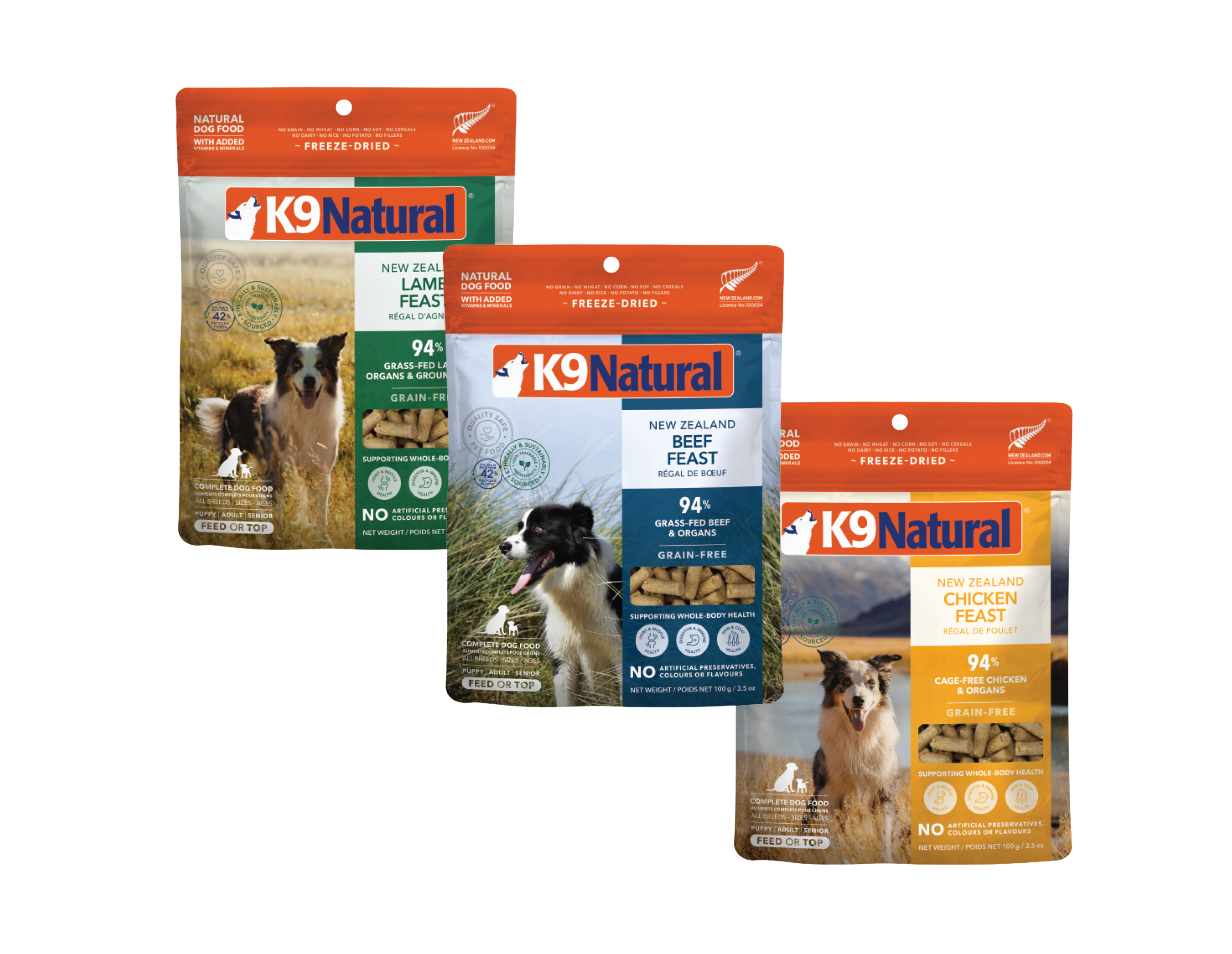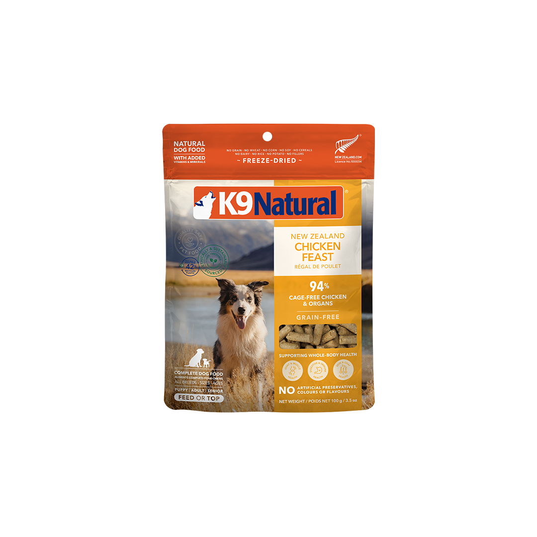 Our complete and balanced Freeze-Dried New Zealand Chicken Feast contains 94% Cage-Free Chicken and Organs with New Zealand Green Mussels, Flaxseed Flakes, Vegetables, Oils, Kelp, Vitamins, and Minerals in support of your dog's whole-body health.